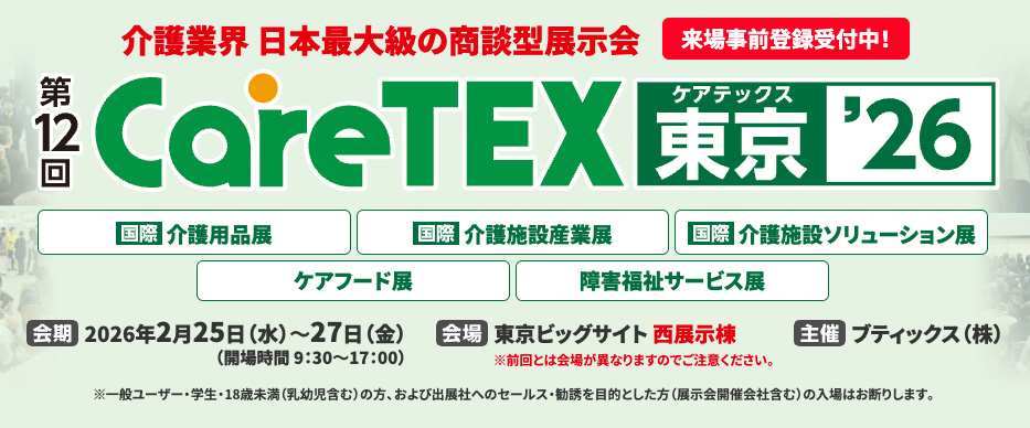CareTEX 東京は、日本最大級の介護・福祉業界向け専門展示会として、介護用品・施設設備・テクノロジー・ケアフードなど幅広い商品・サービスが一堂に集まるビジネスイベントです。施設運営に関わる方々にとって、最新のソリューションや導入のヒントを得る絶好の機会となっています。